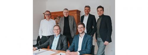 Bei der Gründung von Serverland: (v.l.n.r.) vorn: Die Geschäftsführer der Serverland Hermann Bookjans und Dr. Jörg Schuirmann; hinten: Karl-Heinz Siekhaus (Geschäftsführer SW Ahaus), Thomas Spieß (Geschäftsführer SVS-Versorgungsbetriebe), Andre Lensing (Geschäftsführer ITM-Gruppe) und Ron Keßeler (Geschäftsführer SW Borken und Coesfeld) Quelle: SW Coesfeld |