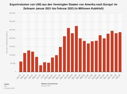 Im Februar 2023 exportierten die USA nach Zahlen der EIA rund 238 Milliarden Kubikfuß an flüssigem Erdgas nach Europa. Im Vergleich zum Monat zuvor stiegen die LNG-Exporte um knapp 7 Millionen Kubikfuß. Im Jahr 2021 war die USA bereits der größte Lieferant von LNG für Europa. Der Statistik ist weiter zu entnehmen, dass das Exportvolumen seit Beginn des Krieges in der Ukraine deutlich zugenommen hat.