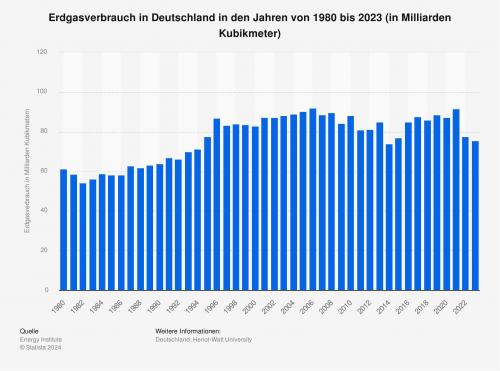 Der Konsum von Erdgas in Deutschland ist in den vergangenen 40 Jahren seit 1980 bis zum Jahr 2021 graduell gestiegen und im Jahr 2022 das erste Mal gesunken – auf ein Niveau von 77,5 Milliarden Kubikmeter. 2023 sank der Verbrauch weiter auf 75,7 Milliarden Kubikmeter. Diese Entwicklung spiegelt die teilweise Substitution des fossilen Energieträgers Erdöl durch Erdgas wider. Der Rückgang lässt sich auf die gekappten Erdgaslieferungen aufgrund des russischen Angriffskrieges zurückführen.