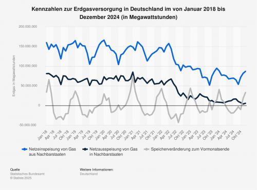 MWh) Erdgas aus den Nachbarstaaten eingespeist (blaue Linie), während gleichzeitig knapp 5,6