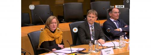 Kerstin Andreae (Bundesverband der Energie- und Wasserwirtschaft) trägt am 6. Dezember im Wirtschaftsausschuss ihre Bedenken gegen die Art der Erlösabschöpfung vor. Ihre Kollegen Wolfram Axthelm (Bundesverband Windenergie) und Ingbert Liebing (Verband kommunaler Unternehmen) warten, bis sie dran sind Quelle: Bundestag |