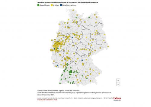 Stand der Kommunalen Wärmeplanung in Gemeinden mit mehr als 45.000 Einwohnern 2024 (zur Vollansicht bitte auf die Grafik klicken) Quelle: BDEW |