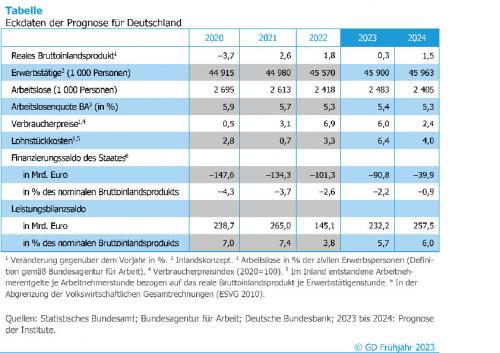 Eckdaten der Frühjahrsprognose 2023 Zum Vergrößern bitte auf die Grafik klicken Quelle: Gemeinschaftsdiagnose |