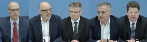 Die Wirtschaftsweisen bei der Frühjahrsprognose (von links): Stefan Ederer (Wifo), Timo Wollmershäuser (Ifo), Stefan Kooths (IfW), Torsten Schmidt (RWI), Oliver Holtemöller (IWH) Quelle: E&M / Harmsen |