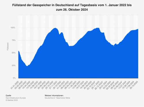 Innerhalb der Europäischen Union verfügt Deutschland über die größten Speicherkapazitäten von Erdgas, insgesamt sind es circa 261 Terawattstunden. Wie die Statistik veranschaulicht, sind die Füllstände der deutschen Gasspeicher im Laufe eines Jahres und einer Heizperiode deutlichen Schwankungen unterworfen. Einen sehr ähnlichen Verlauf kann bei weiteren europäischen Ländern beobachtet werden.