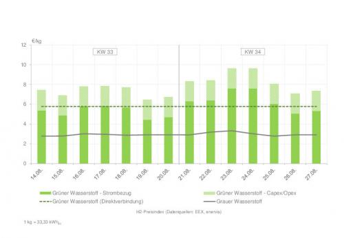 | Wasserstoffpreisindex in den Kalenderwochen 33 und 34 Zur Vollansicht bitte auf die Grafik klicken Quelle: enervis energy advisors GmbH / EEX |