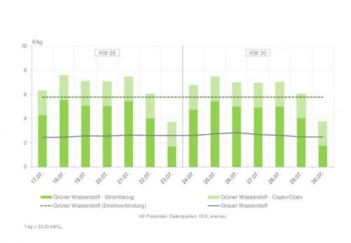 | Wasserstoffpreisindex in den Kalenderwochen 29 und 30 Zur Vollansicht bitte auf die Grafik klicken Quelle: enervis energy advisors GmbH / EEX |