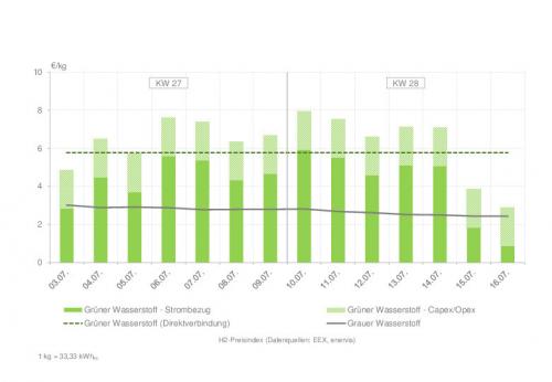 | Wasserstoffpreisindex für die Kalenderwochen 27 und 28 Zur Vollansicht bitte auf die Grafik klicken Quelle: enervis energy advisors GmbH / EEX |