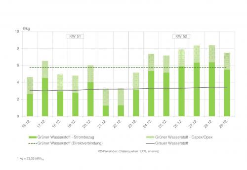 Die Gestehungskosten für strommarktbasierten grünen Wasserstoff sind in den Kalenderwochen 51und 52 nach der Preisexplosion in KW 50 wieder gesunken. Das Zweiwochenhoch lag bei 8,39 Euro/kg, das Zweiwochentief bei 3,26 Euro/kg. Im Wochenmittel ist der Preis von 4,78 Euro auf 7,40 Euro/kg gestiegen.