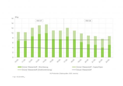 | H2-Preisindex für die Kalenderwochen 7 und 8 (zur Vollansicht bitte auf die Grafik klicken) Quelle: enervis energy advisors GmbH / EEX |