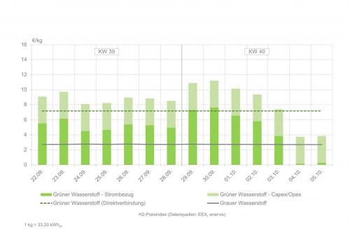 | H2-Preisindex für die Kalenderwochen 39 und 40 (zur Vollansicht bitte auf dei Grafik kicken) Quelle: enervis energy advisors GmbH / EEX |