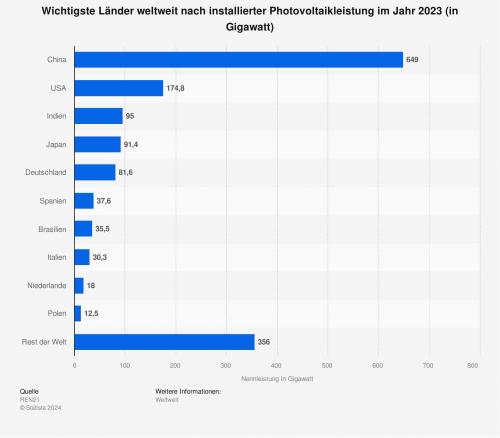Im Jahr 2023 erreichte die kumulierte installierte Leistung durch Photovoltaikanlagen in China rund 649.000 MW – das entspricht einem Anteil von knapp 41 Prozent an der weltweit installierten Leistung der Photovoltaikanlagen. China war somit mit Abstand das Land mit der meisten installierten Photovoltaikleistung. Es folgten die USA, Indien und Japan.