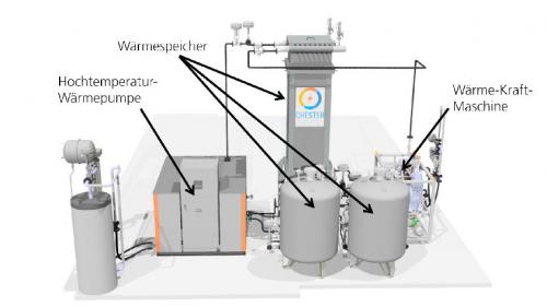 Kubikmetern Nitratsalzen gefüllt ist. Eine Hochtemperatur-Wärmepumpe erhitzt mit dem zu speichernden Strom das Salz auf die Schmelztemperatur von 150