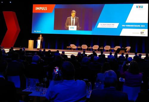 Man sehe selten, was nicht schief geht, sagte Habeck auf der Jahrestagung des Verbands Kommunaler Unternehmen (VKU) und dankte ausführlich für die verlässliche Daseinsvorsorge der Stadtwerke, besonders im Krisenjahr 2022. Es sei gemeinsam gelungen, über den Abgrund von 50
