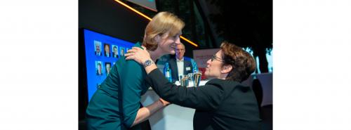 | Kerstin Andreae (BDEW, l.) hielt nicht nur die Laudatio, sie gehörte auch zu den ersten und herzlichsten Gratulantinnen. Quelle: E&M / Knut Vahlensieck |