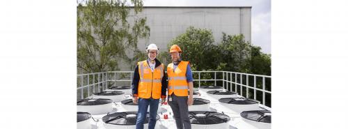 Auf dem Dach der neuen Energiezentrale Stonsdorf. Vor den Luftkühlern stehen Martin Heimann (links) und Tim Storbeck Quelle: Equans |
