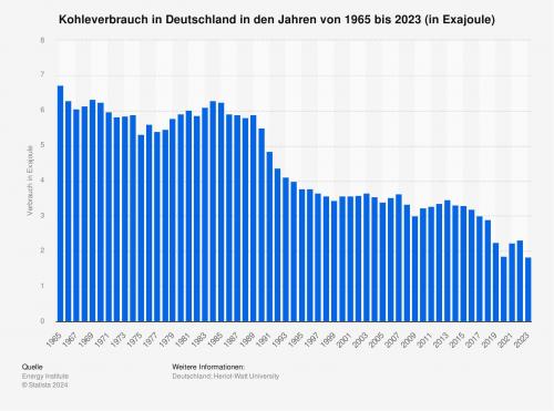Die Statistik zeigt den Kohleverbrauch von Deutschland in den Jahren von 1965 bis 2023. Berücksichtigt wurden ausschließlich handelsübliche feste Brennstoffe, zum Beispiel bitumenhaltige Steinkohle und Anthrazit (Hartkohle), Hart- und Weichbraunkohle. Im Jahr 2023 belief sich der Kohleverbrauch in Deutschland auf rund 1,8 Exajoule.