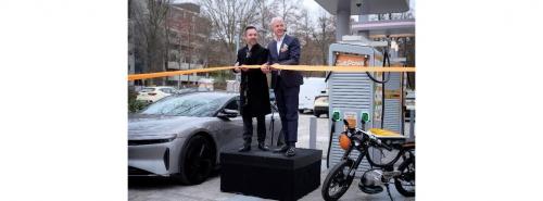 Eröffnen einen neuen Ladepark in Charlottenburg: Berlins Wirtschaftsstaatssekretär Severin Fischer (links) und Cutpower-CEO Karl Eberhard Hunke Quelle: Flexpower |