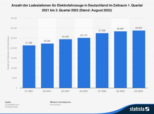 Im dritten Quartal des Jahres 2022 lag laut Charge Map die Zahl der Ladestationen für E-Autos bei rund 28.900. Im Vorjahresquartal waren es etwa 24.500. Annähernd zwei Drittel der Ladestationen verfügen über eine