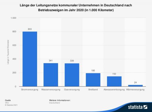 Die Statistik zeigt die Länge der Leitungsnetze kommunaler Unternehmen in Deutschland nach Betriebszweigen im Jahr 2020. Im vergangenen Jahr betrug die Länge der Stromnetze kommunaler Mitgliedsunternehmen des VKU rund 803.000 Kilometer. Der Verband kommunaler Unternehmen e.V. vertritt rund 1.500 kommunalwirtschaftliche Unternehmen in den Bereichen Energie, Wasser/Abwasser und Abfallwirtschaft.