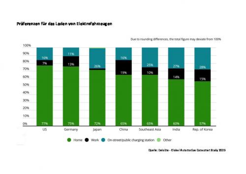 Zwar wird derzeit in Deutschland auf politischer Ebene sehr viel über die Zielgrößen für den Ausbau der öffentlichen Ladeinfrastruktur diskutiert. Laut der Deloitte-Studie geht aber die Mehrheit der Befragten davon aus, vorwiegend zu Hause zu laden – in der Regel mit einem Energiemix aus herkömmlichem und grünem Strom. In Deutschland beträgt der Anteil der Zu-Hause-Lader 75