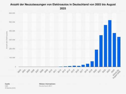 Zwischen Januar und August 2025 wurden in Deutschland rund 336.700 Elektroautos neu zugelassen. Im Vergleich zum Vorjahreszeitraum war dies ein Anstieg um gut 39 Prozent. Das Jahr 2024 sah in Deutschland etwa 380.600 Neuzulassungen von E-Autos. Damit lag die Zahl im Vergleich zum Jahr 2023 fast 27,4