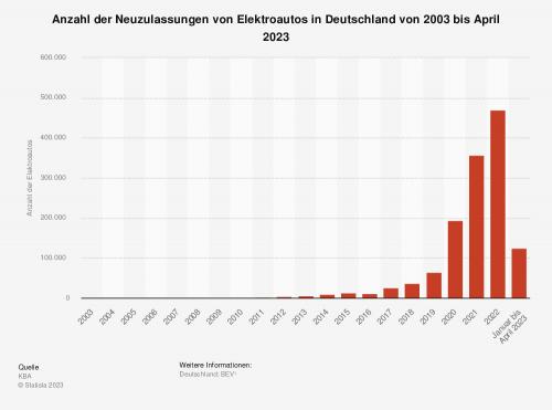 Vom Januar bis April 2023 wurden nach Zahlen des Kraftfahrtbundesamtes knapp 124.500 Elektroautos in Deutschland zugelassen. Im Vorjahr erreichte die Zahl einen Rekordwert: im Verlauf des Jahres 2022 wurden mit rund 470.559 mehr Pkw mit reinem Elektroantrieb neu zugelassen als jemals zuvor.
