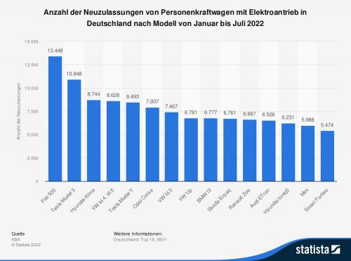 Der Fiat 500 gehört laut Zahlen des Kraftfahrtbundesamtes (KBA) in Deutschland zu den beliebtesten Pkw-Modellen mit reinem Elektroantrieb: Von Januar bis Juli des Jahres 2022 wurden in Deutschland rund 13.400 Exemplare des Kleinwagens mit Batterieelektroantrieb neu zugelassen.