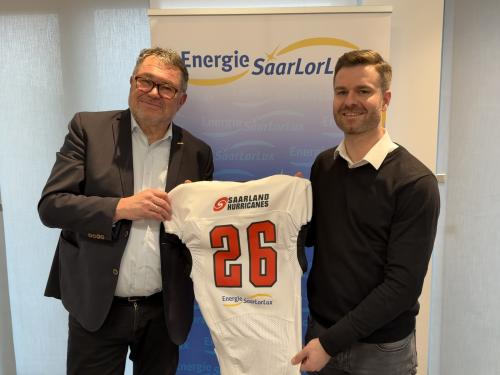 Die „Energie SaarLorLux AG“ engagiert sich von der Saison 2026 an im American Football. Das Unternehmen schloss einen auf zwei Jahre angelegten Sponsoringvertrag mit den Saarland Hurricanes. Vorstandssprecher der Energie Saarlorlux, Joachim Morsch (links im Bild), und Sebastian Jacob, Geschäftsführer der Saarland Hurricanes, stellten am Tag der Vertragsunterzeichnung auch gleich die neuen Trikots vor. Der Start erfolgt im Mai mit dem Heimspiel gegen die Ravensburg Razorbacks aus Baden-Württemberg. Beide Seiten vereinbarten Präsenz an Spieltagen, Ticketaktionen und gemeinsame Formate in sozialen Medien. Der in Saarbrücken ansässige Energieversorger unterstützt seit Jahren Vereine und Veranstaltungen im Saarland.