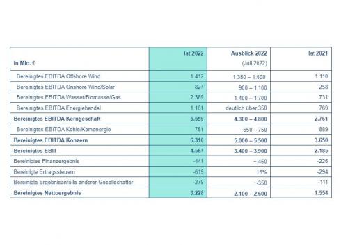 Das Geschäftsjahr 2022 von RWE in vorläufige Zahlen (Zum Vergrößern bitte auf die Tabelle klicken) Quelle: RWE |