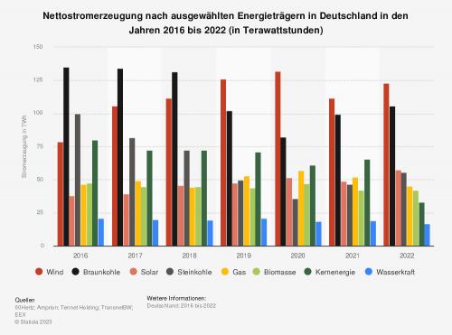 Die Statistik zeigt die Nettostromerzeugung nach ausgewählten Energieträgern in Deutschland in den Jahren 2016 bis 2022. Im vergangenen Jahr wurden zum Beispiel rund 32,8 Milliarden kWh Nettostrom aus Kernenergie erzeugt.