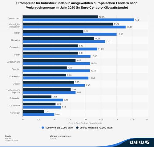 Im Jahr 2020 bezahlten schwedische Industriekunden mit einem jährlichen Stromverbrauch zwischen 20.000 bis 70.000 MW rund 4,62 Cent pro Kilowattstunde Strom. Bei der selben verbrauchten Menge war der Strompreis für deutsche Industriekunden mit 12,06 Cent pro Kilowattstunde deutlich höher.