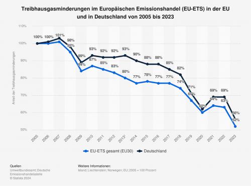 Seit Beginn des Emissionshandels im Jahr 2005 sind die Treibhausgas-Emissionen der erfassten deutschen Anlagen um rund 44 Prozent zurückgegangen, während der Emissionsrückgang europaweit rund 48 Prozent betrug. Quelle: Statista