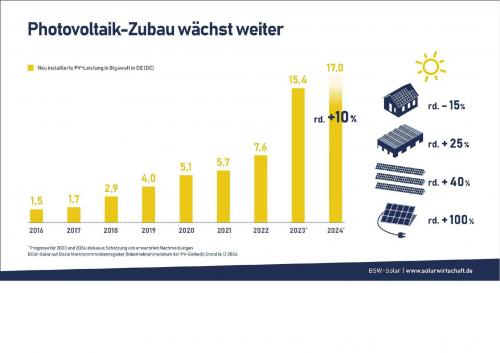 Prozent. Dies berichtet der Bundesverband Solarwirtschaft (BSW Solar) unter Berufung auf Zahlen der Bundesnetzagentur. Für Stromerzeugung aus Sonnenlicht seien 2024 etwa eine Million Photovoltaik-Systeme mit einer Spitzenleistung von rund 17.000