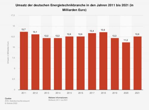 Die Statistik zeigt die Umsatzentwicklung der deutschen Energietechnikbranche in den Jahren 2011 bis 2021 nach Zahlen des Verbandes der Elektro- und Digitalindustrie (ZVEI) und des Statistischen Bundesamtes. Im Jahr 2021 setzte die deutsche Energietechnikbranche rund 12,6