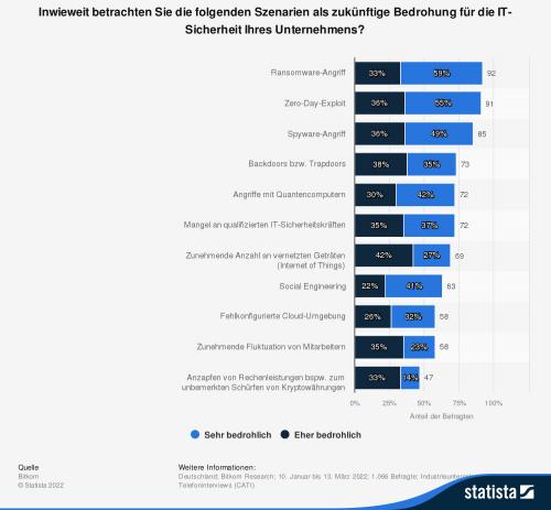 Diese Statistik zeigt das Ergebnis einer Umfrage des Branchenverbands Bitcom zu den zukünftigen Bedrohungen für die IT-Sicherheit in Deutschland im Jahr 2022. Zum Zeitpunkt der Erhebung gaben 91