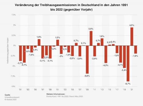 Nach Zahlen des Umweltbundesamtes nahmen die Treibhausgasemissionen in Deutschland im Jahr 2022 gegenüber dem Jahr 2021 um 1,9 Prozent ab. Im Jahr 2022 betrugen die Treibhausgasemissionen in Deutschland rund 746 Millionen Tonnen CO2-Äquivalente.