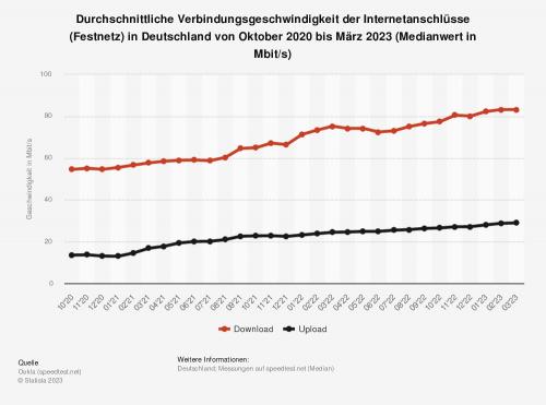 speedtest.net seit Oktober 2020. Im März 2023 lag die durchschnittliche Downloadgeschwindigkeit der Festnetzanschlüsse in Deutschland bei 83,2