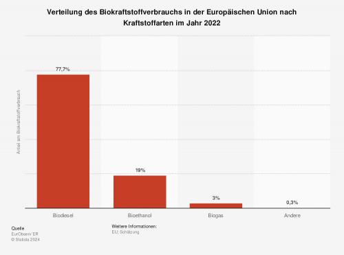 Die Statistik zeigt die Verteilung des Biokraftstoffverbrauchs in der Europäischen Union (EU-27) nach Kraftstoffarten im Jahr 2022 nach Zahlen von Eurobserver. Bioethanol hatte in diesem Jahr einen Anteil von rund 19 Prozent am Biokraftstoffverbrauch im Transportwesen in der EU.