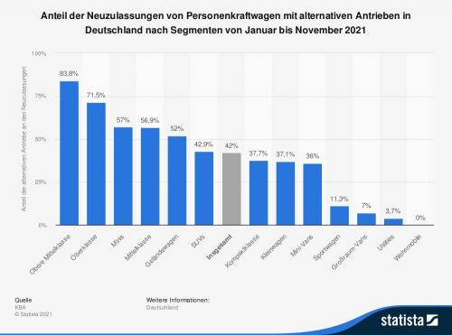 % der Pkw-Neuzulassungen im Segment obere Mittelklasse. Bei den Kleinwagen lag der Anzeil der Stromautos nur bei 37,1