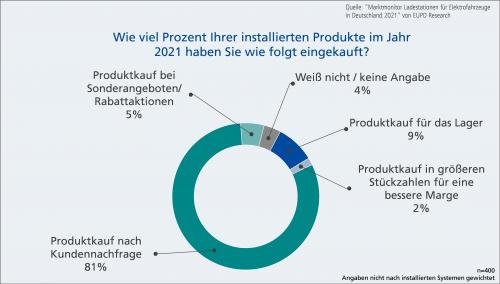 In dem noch jungen Markt der Elektromobilität agieren Installateure durch den stark wachsenden Markt für Ladestationen aktuell sehr bedarfsabhängig, wie die Untersuchungsergebnisse belegen. Mit durchschnittlich 81 Prozent dominiert in 2021 der Produktkauf nach Kundennachfrage. Die Beschaffung höherer Stückzahlen zu geringeren Stückkosten oder der Produktkauf zur Lagerhaltung liegt bislang lediglich bei einer Minderheit der Installateure vor. Gleichermaßen warten lediglich fünf Prozent der Installateure auf Sonderangebote oder Rabattaktionen, um ihre Bestellungen für Ladestationen zu tätigen.