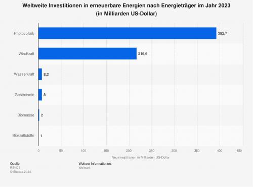 Die Statistik zeigt die weltweiten Investitionen in erneuerbare Energien nach Technologie im Jahr 2023. Im Jahr 2023 wurden weltweit rund 217 Milliarden US-Dollar in Windkraft-Technologien investiert.