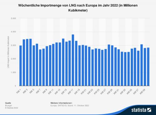 3 LNG nach Europa importiert. Der europäische Import von LNG unterliegt wöchentlichen Schwankungen. Für das Jahr 2022 gilt bisher, dass in der KW
