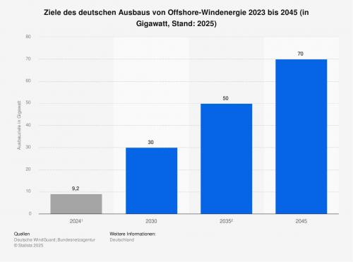 Ende 2024 lag die Leistung der deutschen Offshore-Windenergieanlagen bei rund 9,2 Gigawatt. Da der Anteil der erneuerbaren Energien an der Stromversorgung in Zukunft stark ansteigen soll, wurden mit einer Gesetzesnovelle 2023 neue Ausbauziele für die Offshore-Windenergie beschlossen: Im Jahr 2045 sollen nach den neuen Zielen Offshore-Anlagen mindestens 70 Gigawatt erzeugen. Quelle: Statista